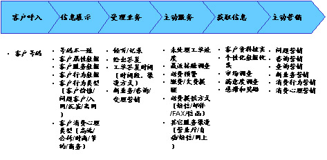 在上面的流程中,将一次客户接触,转变为一次全面的客户互动机会,通过对客户信息360度的洞察和客户的互动沟通,在为客户提供基本服务的同时,根据客户的基本资料、历史消费数据等,挖掘客户的隐性需求,从而有选择的开展客户关怀、客户信息收集、客户维系、主动营销活动。下面以一个电信运营商的客户呼入流程为例,说明在一个以客户为中心的客户接触流程中,坐席代表可以开展的客户接触活动(图4)。
