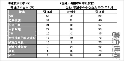 表一中显示的是美国4000多家客服中心在普及一般性技术时的情况。这个表格中,最引人注目的是美国客服中心悠久的历史。"CTI"技术是最近十年产生的、较“年轻”的技术,而表格中排列在"CTI"前面的四项技术都曾在引进CTI之前,作为客服中心必不可少的系统被广泛普及过。