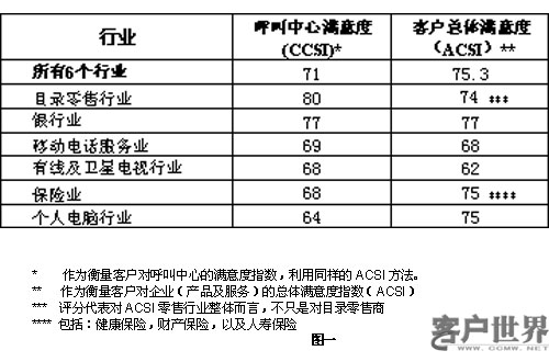 科罗思咨询集团(CFI Group)运用与美国客户满意度指数(ACSI)相同的专利方法,对6个重点行业的呼叫中心进行了呼叫中心的满意度测评。测评结果表明,呼叫中心的表现在不同的行业有很大的差别。各行业之间呼叫中心的满意度分数最多相差16分,得分最低的行业为个人电脑行业(64分),得分最高的行业为目录零售行业(80分)。这种各行业间的巨大差距表明呼叫中心的业务仍在发展之中,要作到使客户满意的话,整个呼叫中心产业仍然需要更多的关注。