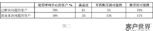 对于任何一个行业而言,“问题解决”都是对满意度影响最大的。对于那些悬而未决问题的客户来说,他们对呼叫中心的满意度的平均得分要比那些已经解决问题的客户低46分。而且,那些悬而未决问题的客户再也不购买该企业产品及服务的可能性是那些已解决问题的客户8倍多(见图二)。有趣的是,在结束通话时,有近四分之一的使用个人电脑呼叫中心的客户的问题无法解决,导致个人电脑座席代表的分数低,以致个人电脑行业呼叫中心的客户满意度低。这和目录零售行业形成了鲜明的反差,只有9%的客户终止通话时还未能解决问题,这直接导致了较高的目录零售行业呼叫中心的客户满意度。