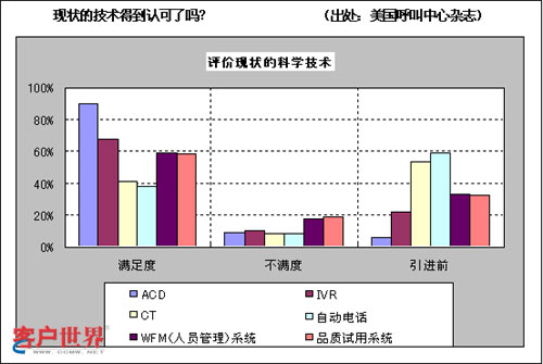 这是调查美国客服中心的管理者们如何评价自己公司引进技术的统计表。虽然“满意”并不意味着“相关技术被有效利用”。可是从调查结果来看,他们对技术的满意度相当高,并且看起来都在有效利用相关技术。