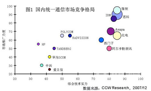 从当前国内统一通信市场竞争格局来看,目前综合技术实力,具体是从厂商所提供的统一通信解决方案中所能够提供的各种沟通方式融合的程度以及每个具体功能技术水平等综合因素考虑,处于前几位的分别是思科、微软、北电、IBM和Avaya,它们目前产品线功能相对比较全面,在国际市场上也是目前的主要竞争力量。