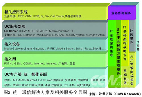 计世资讯(CCW Research)认为,统一通信和我们通常所说的统一通信解决方案是同一个意思,它不是特指一种新的技术,而是指特定的解决方案和应用,通过对各种沟通方式进行融合,无论使用者在任何时候、任何地点、从任何设备上都能从一个“单一的界面”访问其所需的应用和信息,达到降低沟通成本和提高工作效率的目标。