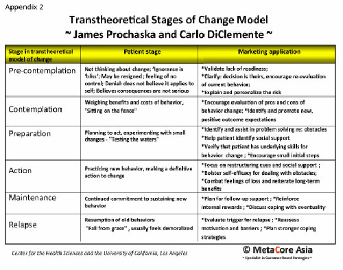 因此,行为改变并不简单如告诉一个尚处于“预热”阶段的人他或她必须每个星期接受三次平均时间在1小时左右的心血管类身体活动 (中间层) ,这样做是不合适的,因为他/她还没有达到改变的这个阶段 (比如说并没有显现出任何心脏疾病以至于要如此紧张)。