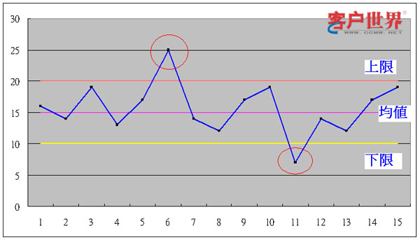 2、如果在失控状态,利用控制图来找出哪个时间段发生了特殊原因,想办法找出这特殊原因;