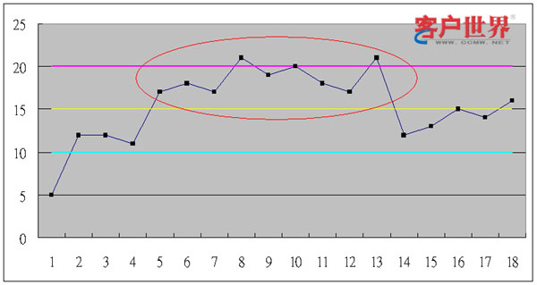 12就是数据有12个点,像是锯齿一样,在均值上下连续跳动(六西格玛用到了14个点,我认为呼叫中心观察到12个点就应该可以确认有特殊原因了)。