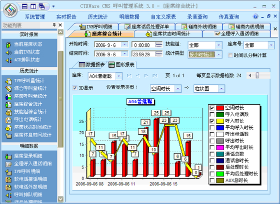 技能组综合统计:可以根据“月份”、“天”、“小时”来统计每一个技能组的综合指标。统计的指标包括:呼入电话量、平均等待时长、最长排队等待时间、通话数量、平均通话时长、应答速度,放弃电话数量、放弃率、平均放弃时长、等待小于20秒电话数量、等待20秒~40秒电话数量、等待40秒~60秒电话数量、等待60秒以上电话数量。