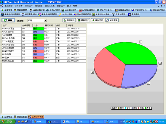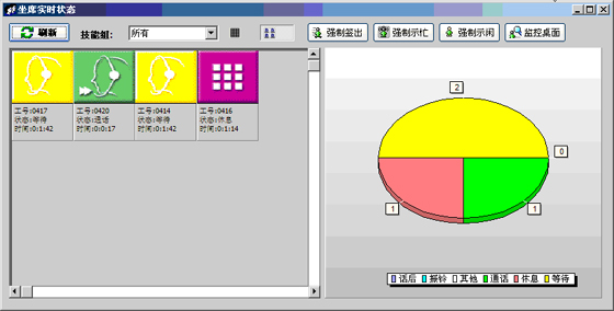 当前座席状态:能够提供座席的状态表示,状态持续时间,对应的技能组,对应的分机号码,对应的IP地址等信息。可以对任何一个座席进行强制签出、强制示忙、强制示闲操作。可以对任意座席进行屏幕监控操作(无需任何第三方软件)。