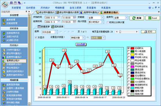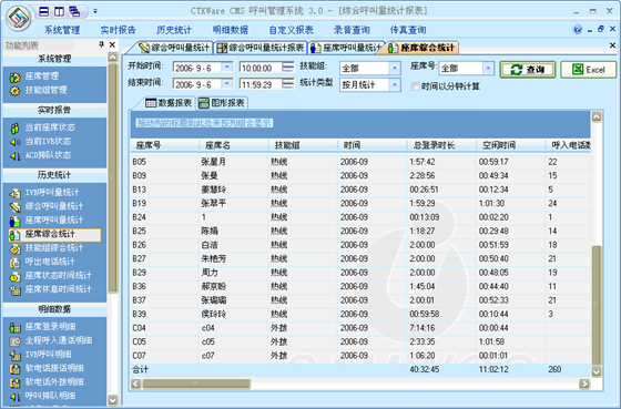 座席综合统计:可以根据“月份”、“天”、“小时”来统计每一个座席的综合指标。统计的指标包括:总登录时长、空闲时长、呼入电话数、呼入时长、平均呼入时长、呼出电话数、呼出时长、平均呼出时长、通话总数、通话总时长、后处理时长、平均后处理时长、AUX总时长、电话振铃时长、平均振铃时长、转移次数、磋商次数、保持次数、平均保持时长。