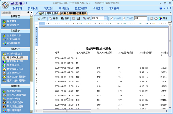 综合呼叫量统计:可以根据“月份”、“天”、“小时”、“半小时”、“周”来统计综合呼叫量。统计的指标包括:呼入电话总数、进入ACD电话总数、ACD应答电话数、ACD通话时长、ACD放弃电话数、软电话呼出电话数、软电话呼出时长、排队接通率。