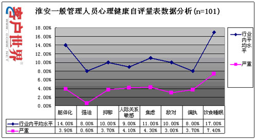 目前,员工压力和心理健康情况已成为困扰整个行业的主要问题之一,我们通过专业方法对淮安中心的员工心理健康和压力状况进行了科学的测量,以了解该中心员工的压力和心理健康状况,具体测量数据如下: