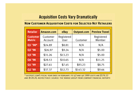 上世纪90年代末期DOT.COM就遭遇了这一严峻问题。70% – 80%的客户在没有完成采购之前就弃网站而去。对于许多人来说这被认为是一个“行业基准”,属于可接受水平,但也有些人开始寻找解决方案。整个行业开始注意到分析家们的忠告:这一水平的放弃率是不被允许的。下面这张由Yankee集团在2000年发布的表格向我们展示了电子商务企业客户获取成本螺旋形盘升的过程。
