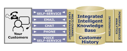 然而另外一个问题又出现了。这个问题就是多次接触,客户或远景客户因为同一个原因通过企业所有渠道联系企业。想象一下一个电信企业,它的用户通过移动电话、发送邮件和传真报告通话质量问题的场景。这样做的结果就是多个重复的“事故单”,接踵而来的是低效和混乱。“Rightnow Technologies”是一家非常著名的多接触点呼叫中心供应商,这家公司建议采用“通用事故”追踪机制,它强调报表和历史纪录必须作为任何一个多接触点联络中心不可或缺的组成部分。“Rightnow”提供的以下插图很清楚地向我们展示了多渠道知识库集成是如何被强制执行的。