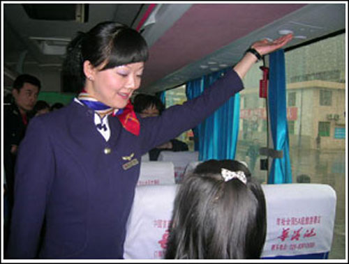 “飞机上要求空姐留长发并盘起,统一形象,因为开舱门风大,头发还要用定型水固定才能保持不乱。作为公交乘务员来说,如果也有统一的形象要求,像女乘务员注重化妆、微笑等形象,乘客肯定会有耳目一新的感觉。”培训完毕,“空姐”王玮还专门登上了一辆306路旅游专线,纠正乘务员在报站、卖票和提醒让座等服务中的不规范做法。“师傅,麻烦给老人让个座”,如果这句提醒换成“师傅,请给这位老人让个座好吗?”听起来是不是更加亲切,更容易让乘客接受?对于王玮的提醒,听课的乘务员纷纷点头。600路乘务员崔武娟告诉记者,原来在服务中,肢体语言和说话方式不到位,也会给人不礼貌、不尊重的感觉,今天一学习,自己今后就会更加注意了。