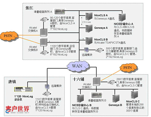 目前交通银行卡中心已有1370线录音系统,其中有288座席是使用的NICE录音系统,其余使用的是其它品牌的录音系统。考虑到最大程度的利用原有资源,NICE提供了完整的利旧方案,针对原NICE的288座席录音系统,无须做任何系统的改动,原系统可以与新增加的NICE录音系统无缝整合,客户在同一界面下可对整个NICE系统进行管理和监听操作,极大地降低了用户的投资成本,同时还缩短了用户的培训和熟悉系统的时间 。