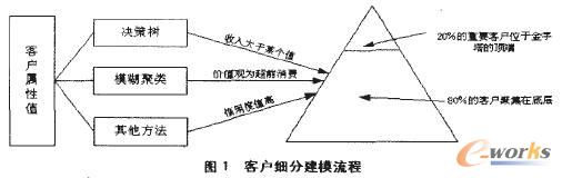 客户属性可以分为内在属性和外在属性,客户的地域分布、客户的产品拥有、客户的组织归属等可以认为是客户的外在属性;性别、家庭成员数、信用度、价值取向等可以认为是客户的内在属性。利用数据挖掘技术中的决策树或是模糊聚类方法来进行挖掘,得到基于客户预测价值的客户金字塔模型。其具体操作如图1所示: