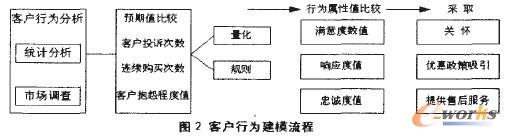 客户行为的表现有如满意度、忠诚度、响应度等等。但是其中客户的满意度决定了客户的响应度和忠诚度。在这里,主要针对客户的满意度来建模。在客户满意度的表现属性中通过产品或服务的属性与客户对他们的预期值的比较、客户对售后服务和支持系统是否满意、客户与企业的交互次数等数据,使用决策树或是神经网络方法挖掘出每个客户的满意度的值,与事先设定或由以往数据统计得到的平均满意度的值来对比,从而做出决策。如图2所示: