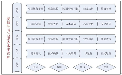 企业可根据自身特征、结合上述内容,定义出符合自身呼叫中心属性的服务水平管理内容。以赛迪呼叫为例,作为一个外包型的呼叫中心,赛迪呼叫结合中国呼叫中心外包市场的特点及自身多年的行业经验,归纳出服务水平管理的五个步骤:立项、启动、实施、评估、改进,具体内容如下: p>