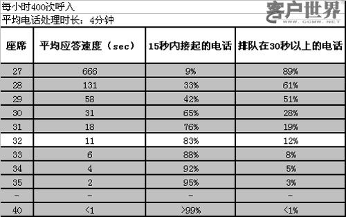 1、在这种情况下,虽然平均应答速度已经达到了11秒,还是有12%的来电要等30秒以上才能得到应答。