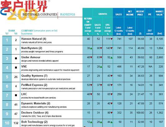 福布斯主办的200 Best Small Companies在美国的评选必须通过一系列的选拔才能拥有入围资格。福布斯判断候选人的标准是——所有收入在500万美元和7.5亿美元之间,以及截至10月1日股票价格在500万美元以上,太多的债务,或者迹象低迷,哪怕企业遇到一点点的法律麻烦,都将使之丧失入围资格。