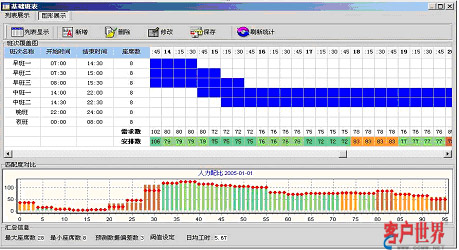 引入呼叫中心排班系统是提升坐席资源利用率的有效解决方案,排班系统可以对大量的历史呼叫数据进行分析,并剔除特殊事件对呼叫量的影响,从而得出呼叫量变化的规律曲线,再辅助对特殊预期事件影响度的叠加,可以对未来一定时间的呼叫量变化做出比较客观的预测(图2)。在预测话务量变化曲线的同时,结合人员技能和班次设定,给出高拟合度的人工排班方案(图3)。更为重要的是,成熟排班系统提供的话务预测模型多具备学习能力,能够将预测的话务数据与实际话务数据进行对比,从而不断提高话务预测模型的预测精度。成熟排班工具可以在保持呼叫中心同等服务水平的前提下,降低人工坐席代表的投入数量,进而释放部分人工资源开展其它业务。
