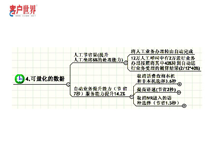 在更短的时间内给出呼入客户以精确的答复,从而在单位时间内处理更多的呼入请求,将大大提高坐席代表的效率。影响坐席代表答复客户的平均通话时长的两个关键因素是,呼叫中心系统的运行效率和坐席代表自身的能力素质。