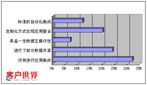 电话中心业务转型带来了信息化策略的转变,目前在电话中心信息化中通常所采用的定制开发的做法产生许多弊端,主要表现在电话中心信息系统与其他信息系统的集成度以及电话中心信息系统对业务流程优化的支持程度两个方面,我们可以看到,没有进行应用集成的比例是最高的,其次是通过定制开发实现集成或进行数据共享的方式,而通过标准方式进行自动化集成的比例相对较少。