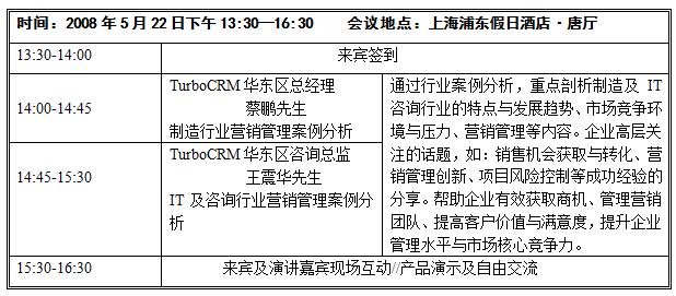 TurboCRM公司将于5月22日在上海浦东假日酒店举办“CRM营销管理行业应用研讨会”,诚挚邀请咨询行业、IT行业、制造行业总裁、市场总监/经理、CIO等企业代表在百忙之中拨冗出席。