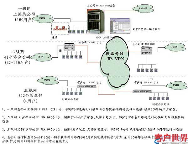 根据合同,阿尔卡特朗讯将提供1 套Omni PCX Enterprise(面向大中型机构的通信平台)500 用户作为核心交换节点,394 套Omni PCX Office(面向中小型机构的通信平台)系统分别为4-160 用户作为分支交换节点。全网总计多达6000 多个用户,覆盖1 个总公司、41 个分公司和352 个营业部。在设计组网方案时,阿尔卡特朗讯根据用户的需求和实际情况,并充分考虑现有的数据网络资源,提出采用星状网络组网结构建设PBX VOIP 语音网络,不仅可以充分保障通信的安全性和可靠性,同时还可最大限度保护现有投资,节省费用。