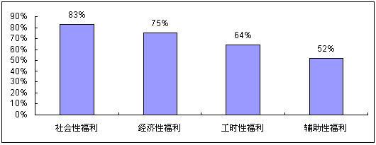 第五,IT服务行业的福利主要集中于社会性福利和经济性福利。从调查结果来看,诸如带薪年假、弹性工作制、年度旅游、生日礼物、不定期部门活动、体验、EPA等工时性福利和辅助性福利的享受比例还比较小,分别占被访企业的64%、52%。赛迪顾问认为,随着《新劳动合同法》的实施以及相关政策影响,企业会更加积极主动地推动员工福利计划的创新和发展。