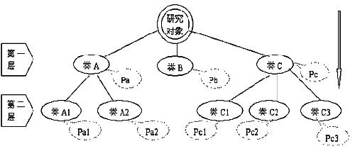 量化作为一个过程,不是一蹴而就的,它大致需要经过几个阶段:因素分解→评分→汇总。其根据的是这样一个思路:将定量分析的对象按照合理的方式分解成重要的几个影响因素,对每个部分依照各自的标准进行评分,然后将各部分的分数乘以权值并相加,所得的分数就是该对象的量化值。整个过程的难点和重点是“分解”并“确定”权重阶段,要求执行者对分析的对象有系统性的把握,了解分析过程中的各个因素并能优化分配。“分解”包括两个方面:“分类”与“分层”。分类是将研究对象中包含的因素分门别类;分层就是对不同类别的因素再次分类,并放入下一层次。分解其实就是一个分类、分层再分类的过程,如树枝一样向下延伸下去,形成一个如下图所示的树形结构。