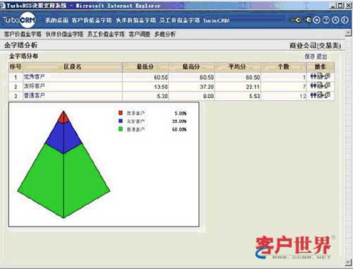 根据预先设定的客户价值评估模型,CRM会自动计算出每个客户的价值得分以及对应到不同等级的客户价值,并会记录到客户项下,便于业务人员在与客户接触时,直观了解客户价值情况。客户价值金字塔分析(如图),可以动态的了解各类客户的价值分布。