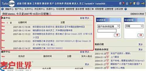 TurboCRM系统的消息中心是协同工作的核心,当客户接触过程有进展时,相关员工的桌面会出现消息提醒,以方便员工及时地了解客户动态。