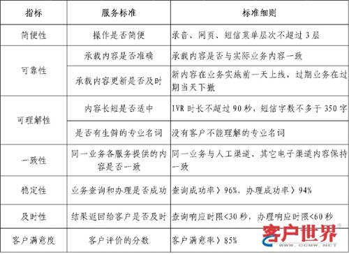 为了使电子渠道的服务标准贴近客户的需求,使内部的质量监测结果与客户满意度相一致,制定一套客户化的服务标准至关重要。我们首先从客户调研出发,了解客户对电子渠道的服务过程中关注的关键指标。通过调研发现,客户对电子渠道的服务质量通常从:简便性、可靠性、可理解性、及时性、稳定性、一致性等六个方面进行感受和评价。因此我们将客户关注的关键指标进行内化,制订了以下几个方面的服务标准: