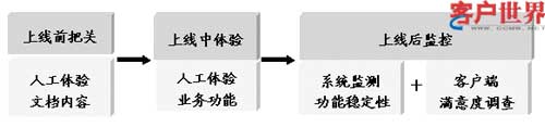 (2)上线中人工体验监控:业务上线电子渠道后立即人工体验,以客户的感知为主要依据,体验业务功能是否正常。