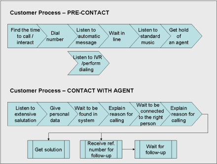 首先第一步,客户相关的业务流程必须从客户的角度而非企业角度来定义。这和“自内而外思想”无关,我们要做的也不是显示我们在企业内组织活动的能力有多强而是了解客户在与我们互动时的感受并由此展开一系列行动。客户并不知道——也不关心——企业用了哪个尖端的CRM软件,呼叫中心代理的工作环境如何,文档扫描过程是否是自动化的。客户关心的是那些在流程优化一开始就被遗忘的很基本的东西,比如说简单快速地找到一个应该倾听她们问题的人,因为我们是站在企业的位置在看问题。