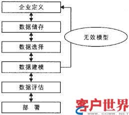 要使CRM产生效益首要任务就是数据采集。所谓数据采集即对大量数据中的新奇、隐含和可控的知识进行重要提取并且可利用其做出准确的预测,找到好的顾客,提出合适的附加产品等。一般数据采集包含以下六步:企业定义→数据储存→数据选择→数据建模→数据评估→部署,如图1所示。