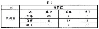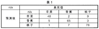 表1总结了对水果农场进行数据采集的结果:竖列显示了农场实际售出的水果吨数,横行表示农场将要卖出水果吨数的预测值。因此在本数据采集中,对苹果预测的准确率达到48/54(=48+5+1),该数据采集的整体准确率达到191/218=0.8761。