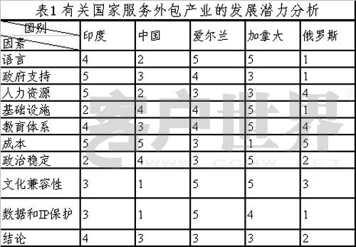 但从发展的角度来看,虽然中国承接服务外包的综合实力相对逊于印度和爱尔兰,但中国以自身特有的优势,被公认为是一个新兴的外包中心。通过国际权威分析机构对承接跨国公司服务外包业务所需的语言、政府支持等综合因素的定性分析,可以看出我国服务外包具有较大发展潜力,将成为国际服务外包业务新的承接地,见表1。