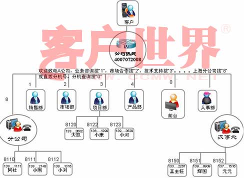 3.1 如何将呼叫中心与企业运营管理融合一直以来,呼叫中心座席的形式比较固定,大都通过长期坐在办公室的人员使用PC机和电话机结合的方式进行工作。但是,这种形式显然不能满足中小企业运营管理的需要,在以销售为重的中小企业中大部分人员并不完全坐在办公室工作,如客户经理、客户服务工程师,即使坐在办公室,也不会一直在等着接电话,如开发工程师、生产车间的人员等等。如何既要满足企业运营的需要,又要实现呼叫的管理和分配呢?我们只需要将座席的形式简化,将呼叫分配的目标扩大就可以了。手机是目前最常见和普遍的通信工具,只要我们将手机做为座席进行管理,既不改变现有的组织架构,又能充分利用呼叫分配工作并对工作人员进行管理,这将大大提高中小企业运营管理的灵活性和变通性。企业组织架构如下: