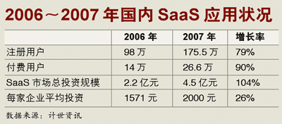 计世资讯《2007-2008年软件运营服务市场研究报告》数据显示,2007年管理型SaaS应用市场规模为4.5亿元人民币,付费企业用户数为26万,企业年平均消费水平仅为2000元/年,其中近八成用户年平均消费低于2000元。目前国内SaaS的用户群仍以中小企业用户为主,不过SaaS提供商Saleforce的加入有望改变这一现状。
