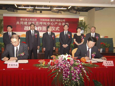 签约仪式在密云瑞海姆田园度假村举行,双方就共建北京呼叫中心产业基地项目签订了《共同建设北京呼叫中心产业基地战略合作协议》,北京市副市长苟仲文同志、中国网通(集团)有限公司董事长兼总裁左迅生、副总裁姜正新,北京市发展改革委、规划委等市政府相关部门、密云县人民政府、中国网通(集团)有限公司以及多家新闻媒体共计100余人参加了仪式。