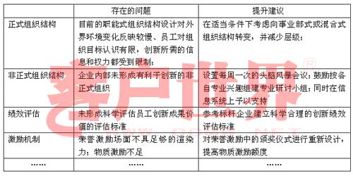 前面有关企业文化是否支撑战略、竞争力,以及企业文化对管理的有效性的评估可以帮助我们提炼出正确的企业文化理念体系。但只有正确的理念体系是不够的,企业文化的落地需要制度的支撑,因此,在评估推进体系中,我们通过开放式问题,对企业文化是否有效地融入了制度中也进行了考察,并将之作为改进建议的重要依据。这些与企业文化密切相关的制度包括组织结构、绩效、薪酬、激励机制、招聘制度、晋升制度、培训制度等。下面以××企业所着力倡导的创新文化在企业制度中的融入问题为例进行说明。