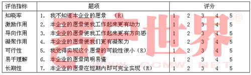 企业文化最终需要员工认可,才能有效发挥企业文化对员工行为的引导作用,从而真正成为一种有效的管理手段。然而,有的企业连愿景、使命这些必须的企业文化理念都没有,有的企业虽然有愿景、使命等企业文化理念,内容一应俱全,但它们不为广大员工所知、或者知晓率很低,还有的则因为企业愿景冗长、企业哲学过于深奥,使得员工知道但不理解,或者理解了但不认可。这些问题使得企业文化在很多国内企业中并没有发挥出应有的管理效用。因此,也有必要对企业文化建设中是否存在此类问题进行评估和调查,作为改进企业文化的依据。我们在正略钧策7D评估推进体系中,精心设计了知晓率、激励作用、导向作用等指标对企业愿景、企业使命、企业哲学、企业价值观在管理中的适用度进行了评价,以下举企业愿景评估的部分题项为例进行说明: