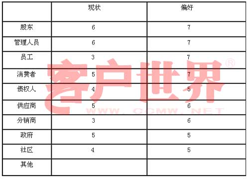 ※请评价您所在企业对以下各利益相关者利益的重视程度,其中在“现状”栏填上您认为的企业对该利益相关者实际的重视程度,在“偏好”栏填上您认为的企业对该利益相关者应有的重视程度:1代表“非常不重视”、2代表“比较不重视”,以此类推。
