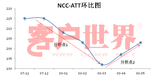 5、 AB点间对应的质量评分范围是82~79分。当ATT小于190秒时,质量评分有加剧下降的趋势,包括软技巧欠缺、解答不完整、查询错误等现象。当ATT大于215秒时,质量评分不再明显上升,排除疑难个案,还需怀疑是否存在业务流程出现问题或Agent通话控制能力不足。(如下图7)