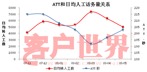 整体呼入话务的ATT合理波动范围是190~215秒;若低于190秒,将出现客户不能忍受的质量受损;若高于215秒,意味着出现企业不能忍受的人力浪费;