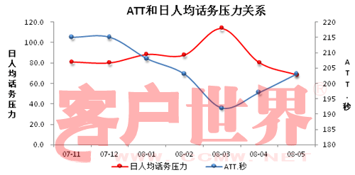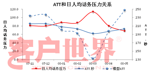 1、 人均话务压力在80~120区间,ATT在215~190呈线性下降;