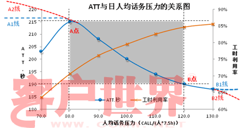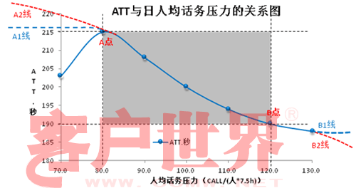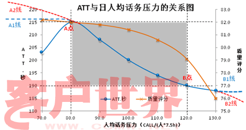 所以,在其它影响因素稳定的情况下,当人均话务压力小于80或大于120的时候,ATT应该保持在这两个压力点对应的时长附近(即190~215秒,如A1和B1线走势)我们暂且认为这是合理的波动范围;若出现A2线走势,浪费的必然是人员效率;若出现B2线走势,牺牲的必然是服务质量。