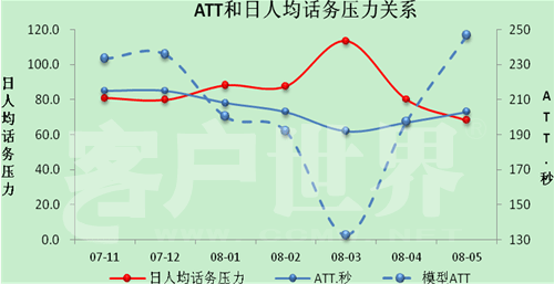 笔者在《呼叫中心话务压力模型及其应用》一文中量化分析了日人均话务压力(通话强度)对ATT的量化影响,建立了一个话务压力模型,阐述了ATT、质量、效率之间的辩证关系,并进一步说明了如何应用该模型评估ATT的合理波动范围、进行人员招聘和排班的测算。